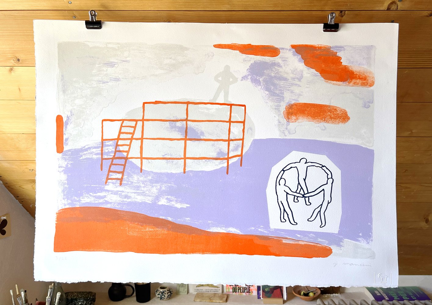 Lithographie et sérigraphie sur papier, 4 passages colorés, imprimée à l’Atelier du Bouc en 2025.