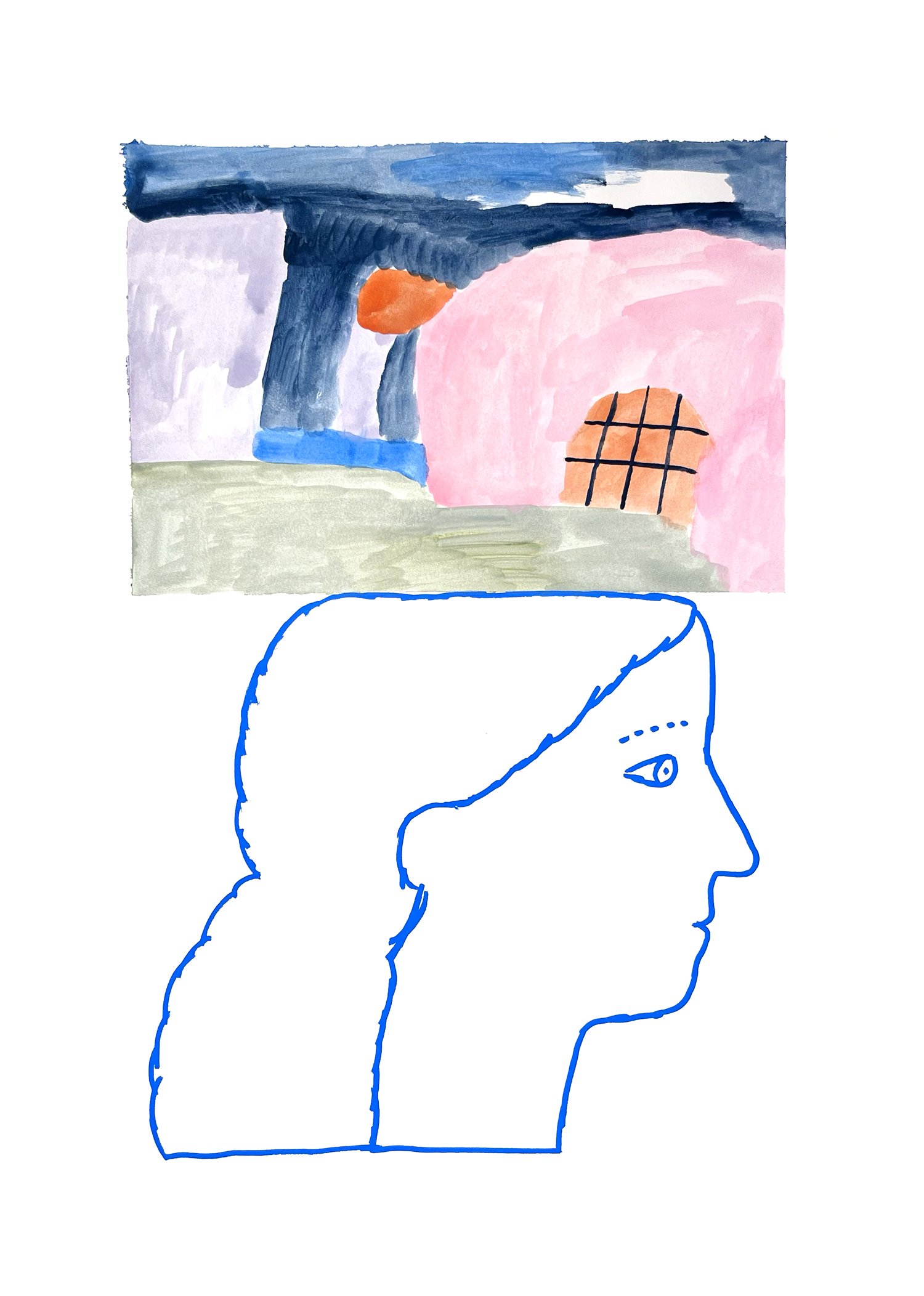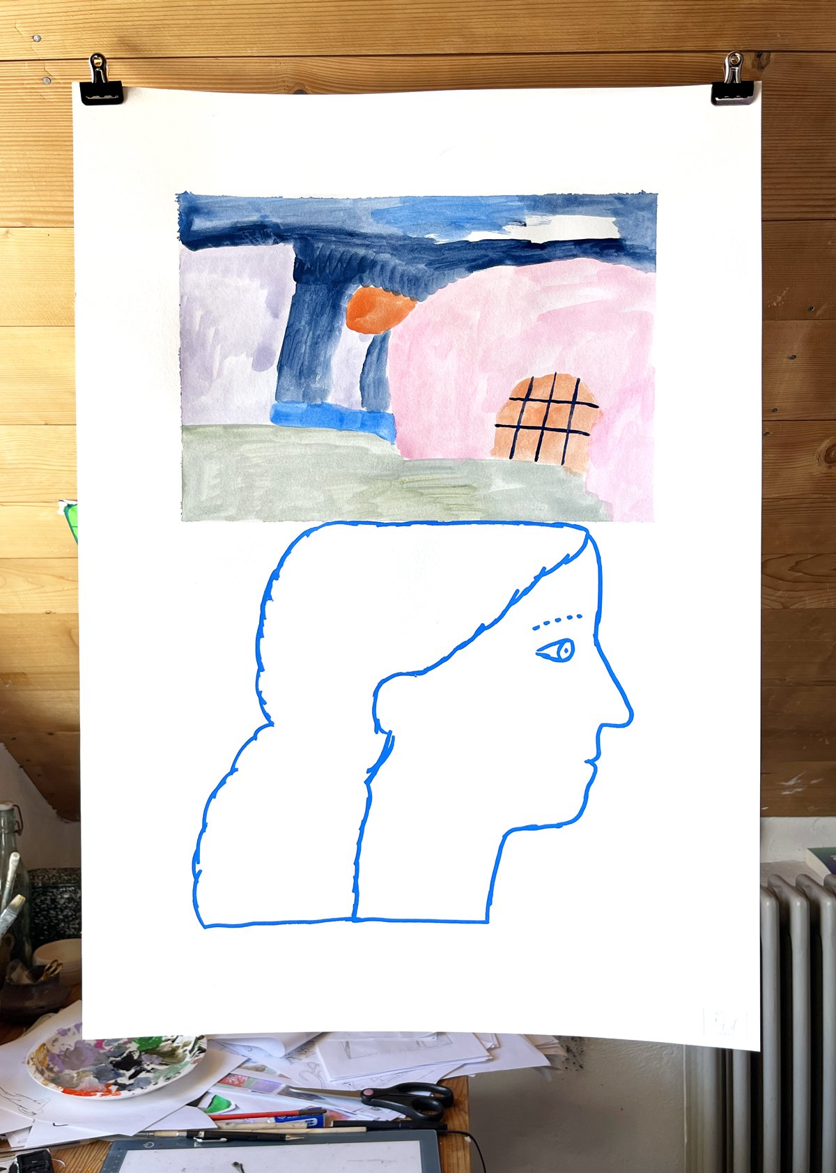 Original painting with screen printed head on paper, made in Atelier du Bouc, 2025.