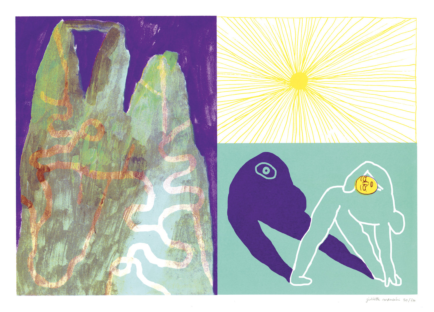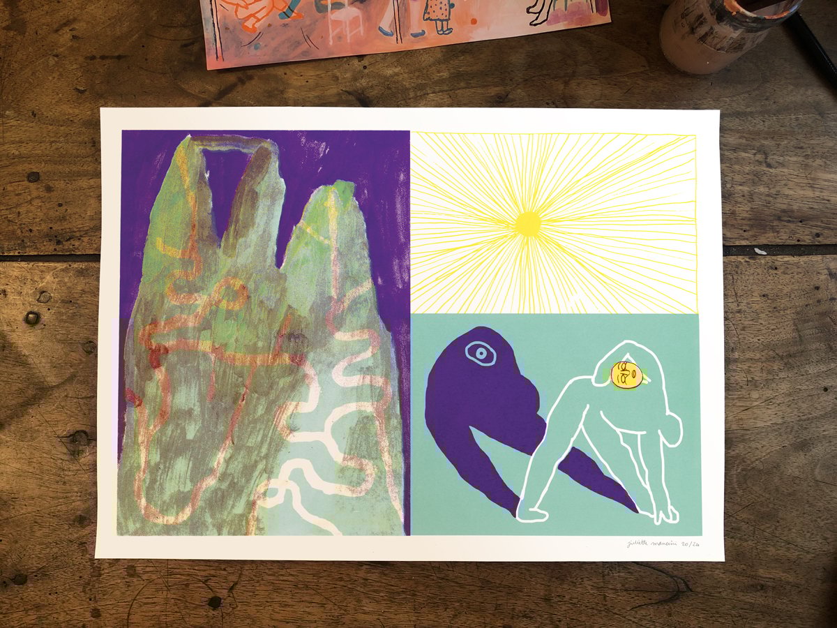 4-color screen print, printed by myself, at Atelier genevois de gravure contemporaine, 2021.